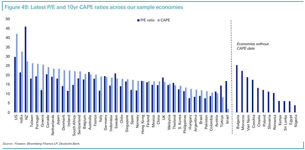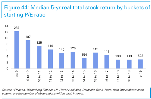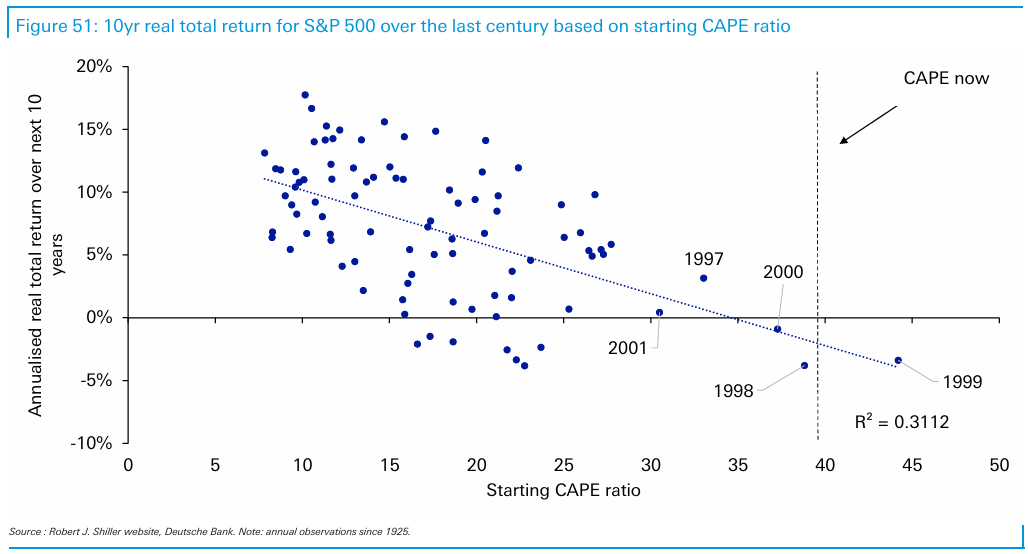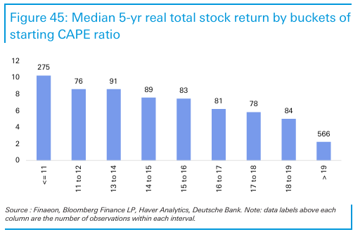 A modo de ejemplo la situación actual de USA, si seguimos a pies juntillas las referencias que proporciona el CAPE, es de una elevada sobrevaloración que históricamente ha estado asociada a bajas rentabilidades 👇