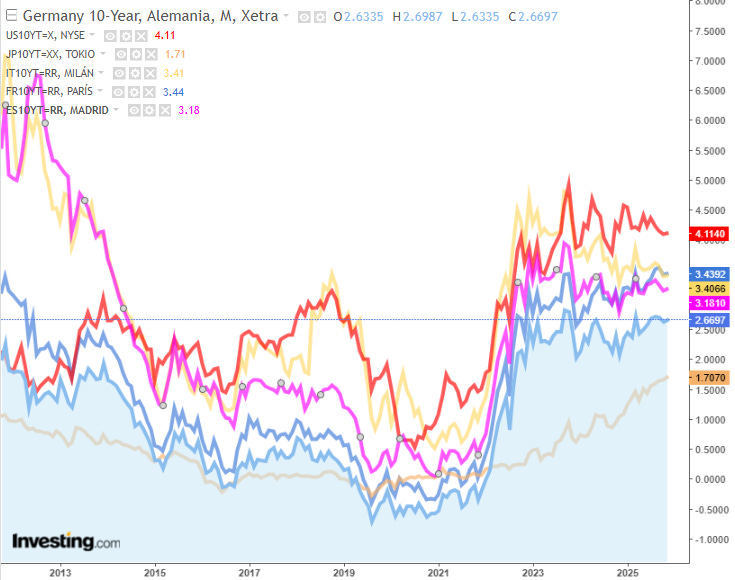 Tipos de interés de los bonos a 10 años desde 2011 de Alemania, USA, Japón, Italia, Francia y España