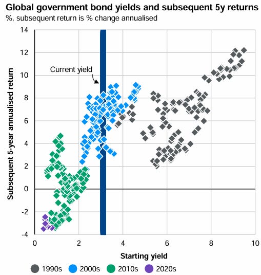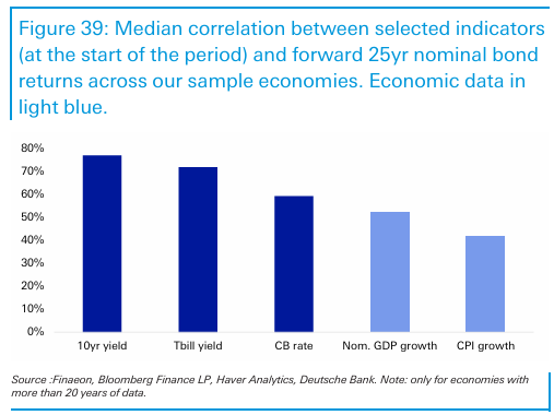 Por ejemplo, cuanto mayor sea la rentabilidad de partida de los bonos a 10 años, de los activos monetarios o los tipos de interés de los banco centrales, mayor será la rentabilidad esperada a largo plazo de los bonos en general.