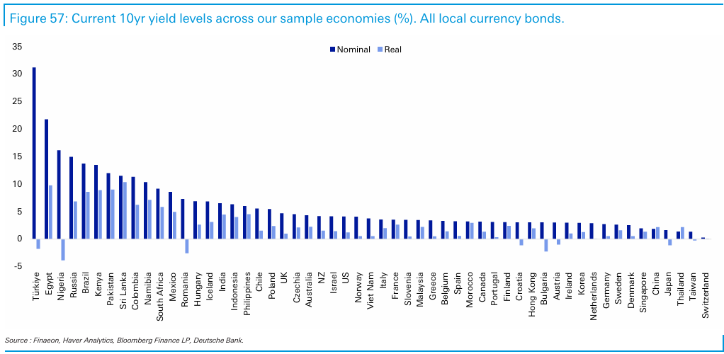 Hay países con unas rentabilidades nominales brutales (Turquía supera el 30%) pero en términos reales (al descontar la inflación) se queda en negativo, lo cual implica que no son realmente tan buena inversión como puedan parecer.