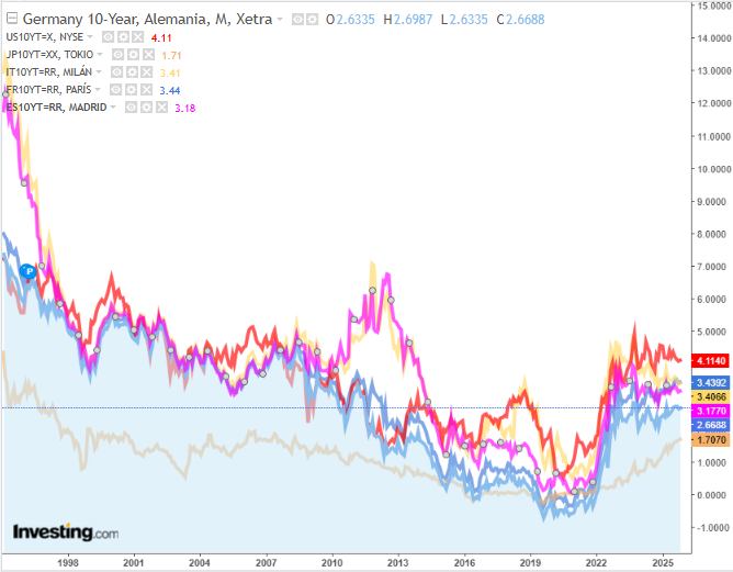 Tipos de interés de los bonos a 10 años desde 1995 de Alemania, USA, Japón, Italia, Francia y España