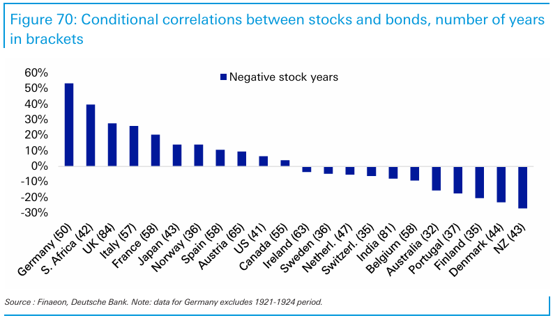 En los bonos del conjunto de países con suficiente información disponible, la mitad de ellos han tenido correlaciones positivas con las acciones en los años en que estas han corregido.